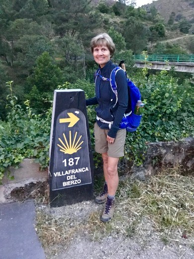 We leave Villafranca early today as we have a monster hill to climb and the temperatures are still a bit hot--high 80s. You can see from the sign below we have only 187 km to Santiago de Compolstela. We are ready--our very nice hotel packed us a "picnic" since we had to leave before breakfast. Most won't, but this is a great hotel--we stayed here on our 2016 pilgrimage.