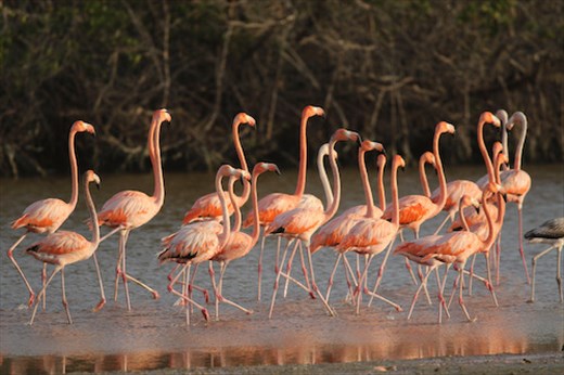 By Friday morning Grace was history and we set out before sunrise. Real birders study field markings, memorize vocalizations and create check-lists. I, on the other hand, am attracted to bright, shiny objects. So while our first stop at a mangrove wetlands near Progresso was a bust for Eric and Connie—neither the Yucatan Gnatcatcher or Mexican Sheartail was seen or heard—John was in hog heaven. The rising sun reflecting off the water and hundreds of pink flamingos wading in cadence reminded me of mornings at Sanibel Island, Florida.