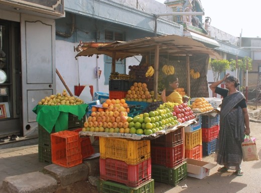 The fruits offered symbolises our detachment, self-sacrifice and surrender to the Almighty. It is also seen as a gesture of good faith when accompanied with, on informal visits to friends and family. This picture was taken on the bustling streets of Mylapore-India.