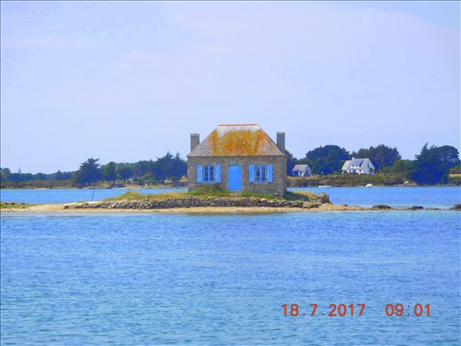 There is a little town not too far from here that we visited yesterday. It's called St. Cado and its claim to fame is the quaint petite house that sits calmly on a tiny little island in the water with its welcoming blue shutters. Everyone who paints here has of course done their version of the cottage and all the postcard displays are filled with different views, taken on sunny days, in the rain, with morning light, afternoon brightness and as the sun sets. So, of course, one of the first things that people do when they arrive, is to whip out their cameras and start shooting photos of the cottage. I was very curious about its history, thinking that it must be something special. Not really, it is the former home of the last oyster fisherman in the town. While we were there a family took their kayaks over to the little island, ascended and checked it out, even peaking in the windows. Since they didn't stay very long, I assume that there wasn't much to look at.