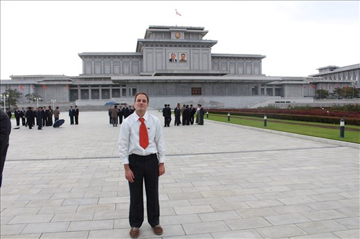 You’ll quickly learn in the DPRK that days are long as a visitor! You’ll rise early, get home rather late in the evening and there’s no stopping back at the hotel if you forget your memory card. If you forget something you’re stuck. Today would be a very special and privileged day for all of us. We visited Kumsusan Palace of the Sun: the final resting place of both the Great Leader and the Dear Leader. It was almost like a work day; we all had to rise early and dress fancily: a collared shirt, tie, and trousers for men and respectable dress for women. The mausoleum is only open on Thursdays and Sundays so very few tour groups get to visit. Rules are strict and as we descended upon the palace we had to leave our jackets, phones, and cameras in a cloakroom. We’re then patted down and searched airport-style and we had to stand, not walk, on these long travelators. Some of them are so long you're standing on them for more than 10 minutes. Visitors, both Korean and foreign don’t enter through the main entrance of the palace, but underground. You’re not allowed to talk loudly and hats must be removed. In groups of four we bowed at statues of the two leaders before we made our day into airport-style blowers. Upon entering a room with red lights, before us lay the Eternal President of the DPRK. In groups of four we had to bow at the feet and at each side but not at the head. Soldiers stand so still the only movement you see from them is the blinking of their eyes. It’s almost holy being here. The Great Leader is to Koreans what the pope is to Catholics or what Muhammad is to Muslims. There would be no hanging around for awhile to check out the glass sarcophagus, but instead were ushered into a room with photos of the Great Leader with other leaders from around the world. Through a series of travelators we went and then it was time to bow at the feet and sides of the Dear Leader. As with Kim Il-sung, soldiers stood perfectly still in each corner as we paid our respects. In an adjacent room, the train carriage that the Dear Leader died in is on display, left just as it was when he died complete with a Apple laptop. It's so moving being here, I think nearly everybody walked out with a tear in their eye. On completion of paying our respects we were able to retrieve our cameras and take photos in front of the palace.