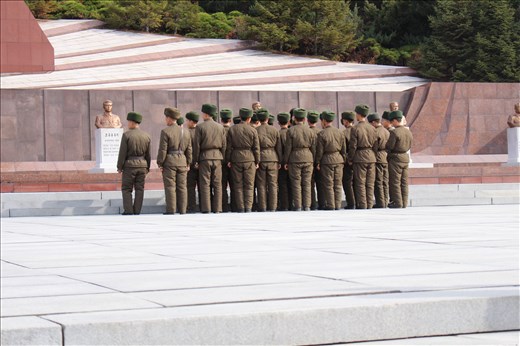 Of the four world leaders that lie in state, Kim Il-sung is the only one in which his mausoleum wasn't purpose-built. The palace was his home during his tenure as Eternal President. After seeing the Great Leader lying in state, it was time to visit the cemetery where the Great Leader's wife Kim Jong-suk, is interred. The view of the city is rather remarkable from the top of the long flight of stairs to the cemetery. Jessica had a boquet of flowers to present at Kim Jong-suk's tomb before we all bowed in unison. At the cemetery I was able to snap the perfect photo of a group of Korean soldiers, from behind.