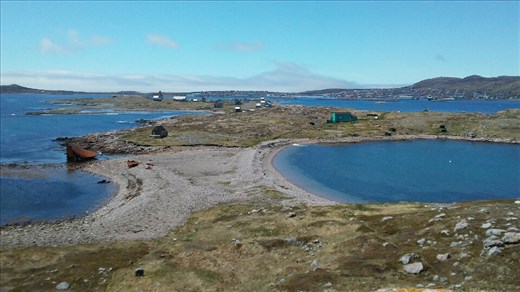 Francois said to meet him near the post office at 6 PM so next on my list today was the trek to Pointe Henry. First I stopped at the supermarket to stock up on stuff for tonight. For such a far-flung locale you'd think Saint-Pierre would be more expensive, but for €25 I got two bottles of wine, stuff for vegetable tomato soup and two pizzas. After my supermarket excursion, I headed for the bush toward Pointe Henry. As it said to allow an hour each direction I had to hurry and walk fast. Shortly after the start of the walk there's no presence of human habitation with the exception of two radio towers. With my phone's fantastic GPS, I could see exactly where I was going. Toward the end of the track I couldn't make it all the way to the end due to a flood but I could see Miquelon from the viewpoint.
