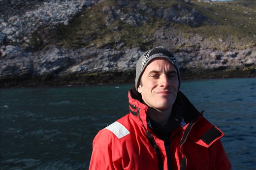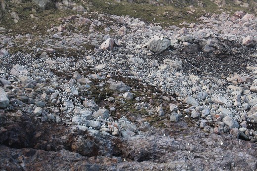 At 6 PM, Francois cruised up on the Zodiac and I rode in an inflatable dinghy for the first time. When I say "inflatable" I don't mean your prototypical bathtub toy; these dinghies have an outboard motor and are often used in Antarctica to ferry passengers from the ship to shore. Francois had me put on a lifejacket and we were off! It's a good thing I didn't forget my beanie because it was very, very cold. As we sailed around the northeastern end of Saint-Pierre and toward Grand Colombier, I had what has to be one of the world's great spectacles: a colony of tens of thousands of puffins.