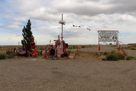 I woke up before Caro & Stefania as it was decided it'd be better for us to hitchhike separately. Sunny but windy it was as typical Patagonian weather. From Perito Moreno, it was still a long way north and I was hoping for some good lifts to get me to Bariloche today. Luck would be on my side early as I was picked up by a retired mechanic on his way to Comodoro Rivadavia, therefore I'd be dropped at the turnoff to Bariloche. It wasn't raining but it was extremely windy as I glanced at one of the small shrines that dot roadsides around the country.