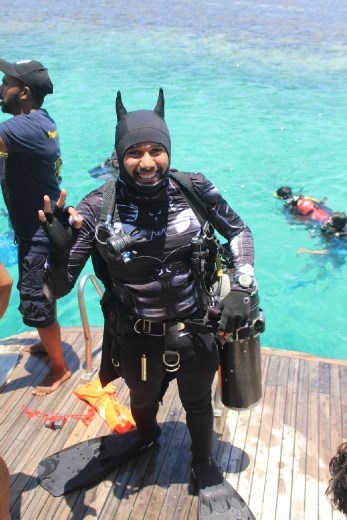 Awake after only three hours of sleep I was ready to put on a heavy oxygen tank and get into the ocean. Hurghada will never win any awards for being the most beautiful city or town but it's a convenient place for those doing exactly what I'm doing. At the port at 8 AM, Luka was already there. I still hadn't made a final call as to whether I was going to dive or snorkel, but when Luka asked me I said "I'm gonna dive." With free coffee and tea, all of the usual stuff was gone over: safety, how to use our equipment, etc. Some of the more experienced divers dove into a shipwreck about 30 metres below the surface. I'm not that good of a diver but I will be someday. Off to the reef we ventured, and then we got ready. Even in hot climates I prefer to wear a wetsuit; it doesn't only keep you warm but protects against coral, jellyfish, and nasty sunburn. One of the dive instructors dresses up as Batman and I said "I thought Batman would fly, not scuba dive."