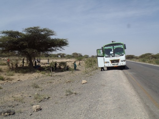 On the road again. This time to Harar in Ethiopia's eastern frontier. I've had at least three days where I've spent the entire day on a bus and several more in which I've had a good part of the day with my butt glued to a bus seat. Buses, at least in Addis are a real pain because all of them leave at roughly 6 AM from the terminal in the dodgiest part of town. Bole and the Merkato area couldn't be more different: in the former I can indulge in an "Avril Lavigne" pizza at the Oh Canada Cafe, yet the latter I have to watch my back and am lucky to have a cup of coffee in a less-than-hygenic tin shack with beggars and flies buzzing about. Thankfully I didn't have to wait long for the bus to go but I was tired as the orange sun rose slowly over the slums of Addis. It's very shocking and sad seeing rows and rows of homeless people huddled next to each other on the sidewalk. Africa is teaching me some lessons, and I must remember James' words: TIA = This is Africa. Sometimes I whinge about a minibus door being slammed in my face but I must remember TIA. The bus ride was the same routine: shut windows, loud music, jam-packed, and one faranji (and that's me). Vehicles of any type never leave until packed solid; there's no such thing as a half-full bus in Ethiopia. A few hours outside Addis we were stopped by the police. I couldn't tell what was going on but it appeared several people had to get off the bus because it was filled beyond capacity. This allowed me a bathroom break and allowed me to snap photos of huts and acacia trees.