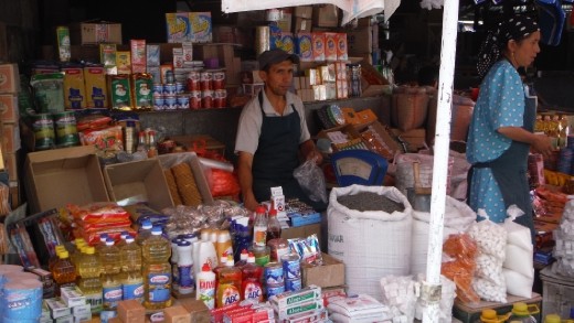 From the border we went straight to the main square of the major city in the region, Khujand with its mosque and Thursday Market – which used to be on just Thursdays but now is everyday. We started with the mosque, or at least Paul did. Women, including me, are not allowed in the mosque. I was told, “Women pray in the homes; men pray in mosques.” Hmmm; this is the first major difference with Uzbekistan, where I had no trouble entering as long as I wore a scarf and most of the mosques we visited were museums anyway.