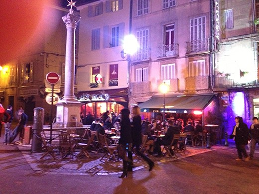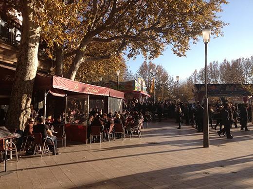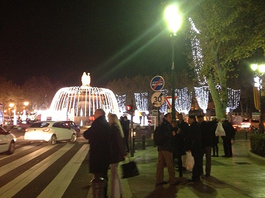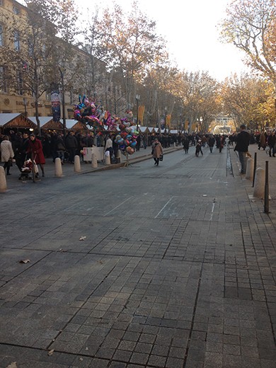 We’re told that in Paris we should expect about 10% of the holiday festivities you see in the United States. Here in Aix-en Provence the city puts up lots of lights and decorations, especially along Cour Mirabeau, the main drag. They construct holiday stands along both sides of the street where vendors sell food and Christmas goodies, including decorations. Lots of rides for the kids, too. I think I mentioned that they put up a large ferris wheel in both Nice and Marseille. The photos may catch a little of the flavor.