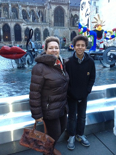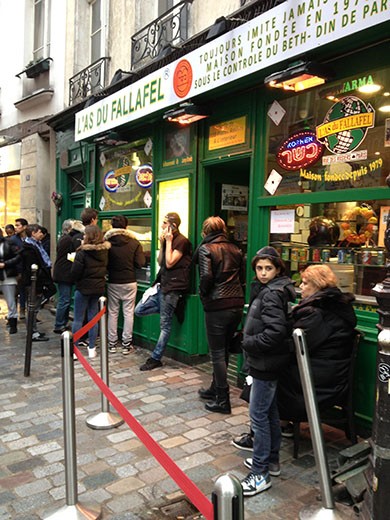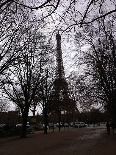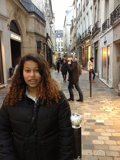 The photo of Sophia is on the main street of the Jewish section of the Marais section of Paris near the Israeli restaurant. Yes, by the way, that is the Eiffel Tower and residential buildings in the area by the tower.