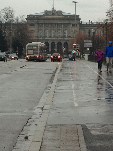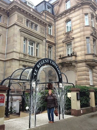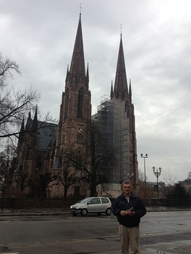 We arrived yesterday afternoon in Strasbourg and it was gray and raining, which was not unusual during the trip. The good news is that it was not real cold on the trip, so weather (considering the time of year) wasn’t much of a factor. Marlene was nice enough to pose outside our hotel in Strasbourg. By the way, we were very happy with our accommodations on the trip. Granted we didn’t get down to the budget level of hotels, but we didn’t stay at the real nice hotels either. Again, finding single rooms that will accommodate four persons in Europe is a real challenge, and eliminates many hotels as a possibility.