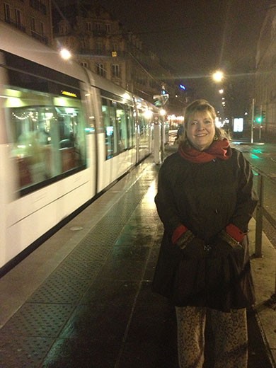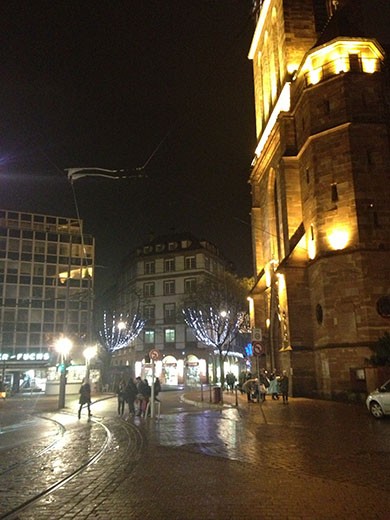 Later we took the tram to Petite France (an old town area) and had dinner (our last night of good food), so there’s a photo of Marlene at the tram station. We also caught a photo of a typical evening street scene in Strasbourg.