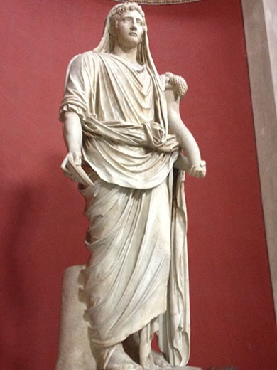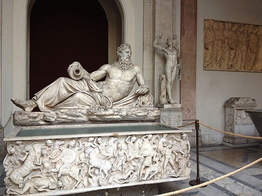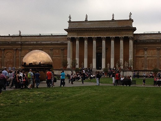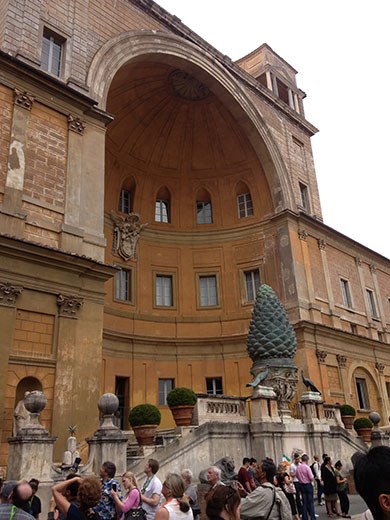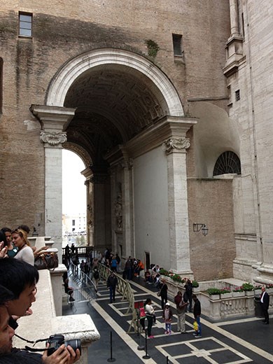 There is no realistic way to describe the museum. I took random photos, primarily based upon when I had a shot free of other tourists. There are a couple of photos outside on the Vatican grounds. Then there is a photo of the Wilsons intently listening to the tour guide. Inside we went, and you get a look at some of the sculptures, of which there seemed to be an endless supply. Not only was the art spectacular, but many parts of the museum buildings were spectacular, as you may be able to determine from the photo of the room with a typical crowd of onlookers. Then, on the way out of the museum (and after going through the Sistine Chapel) and headed to the St. Peter’s Basilica, we took a couple of shots of the outside of the buildings.