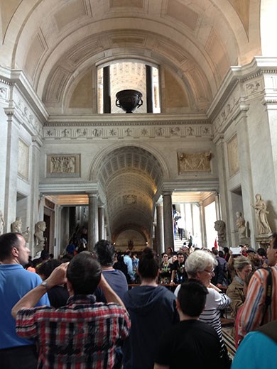 When they say going to Vatican City is a once in a lifetime experience, they really mean it. Once is plenty. It’s like cattle going to slaughter. Again, we had the pre-arranged tour. If we had walked up and seen the line, believe me we would have purchased some post cards and come back and looked at photos on the internet. The Vatican buildings are in this walled community, which is a separate country from Italy. The tour takes you through the Vatican Museum and then the Sistine Chapel (no talking and no photos).