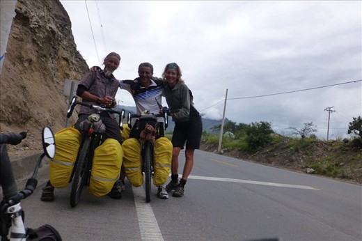 The first night in Ecuador was spend at a friendly farmer's and his wive's cow field. In the high wet grass amongst the cows. It rained in the night and the morning was quite chilly since we were still pretty high up in the mountains. All the next day it wouldn't clear up - riding around in the clouds is kind of sad....though being in Ecuador with it's surprisingly friendly people is very up-lifting. The country side went strange, desert like - very dry and ragged an interesting change. A long, very long downhill followed and we bumped into brazilian cycle tourer and spend a few minutes talking and exchanging email addresses as well as travel experience. ( he has been cycling the opposite route)