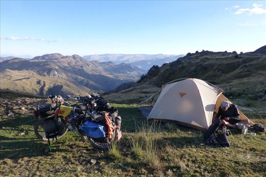 The young couple left the next day while the rest of us spend another day in this beautiful little town, preparing - mostly our minds - for the rough road ahead.....It doesn't really help to think too much, I noticed....it's not even a good idea.. We heard different opinions and suggestions on which road to take since the main road leads to the coast and the mountain roads are unpaved. Looking for short cuts we took the first chance off the paved road and humpty bumptied our way along the dirt road further up a mountain range where we spend the night -still, at least six mile short of the pass of 4200m (13800f) but at 3800m. (12500f). Dusty and tired we camped next to a dirty, but big house. Some truck drivers sat drinking and partly drunk already in front of a house that looked more like a ruin. A woman, dirty hands, face and clothes and a filthy kid shy, distant - almost a bit unfriendly watched us from a distance after we asked if it was OK, to camp. She had offered us a shed nearby, but at second glance it looked unsuitable for animals.....even less so for us so we decided to camp a bit further away overlooking the beautiful mountain range with the Cordillera Blanca snow caped mountain tops peaking out from behind.