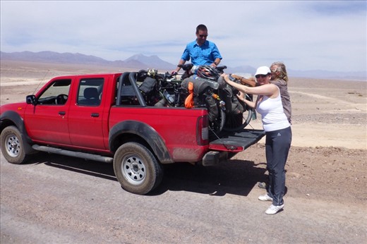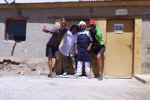 a mining village as it turned out- at the edge of a Salar. The friendly pick-up truck driver answered our questions for food and water.....a little store, perhaps....with "nada" not even the next and the next village after that, he promised. His partner in the truck picked up his walky - talky and was making some kind of arrangements and next thing we knew we were waved to the other side of the road into the village company dining -and kitchen area being served a splendid lunch with soup, meat - sauce spaghetti, fruit and bread at no expense! Now there is a generous and super friendly introductory to another country! James and I were delighted and totally stuffed ourselves and our pockets and soon head out again, not after hugging and thanking the cook and his helper profusely .