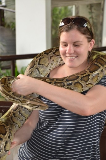 We arrived a bit early for the snake show and for good reasons. We secured front row seats, enjoyed a beer while we waited and watched as about 50 others poured into the small viewing area. The show was short, but interesting to see the handler pi$$ off the large king cobra and two small Siamese cobras. The commentator spoke fairly good English; even trying to throw in a couple marginally funny jokes. At the end of the show, which was 200 baht and about 30 minutes, they offered for the crowd to hold a 8 foot boa. I normally would have passed, but Tim insisted we needed to get a picture for the Blog ;)