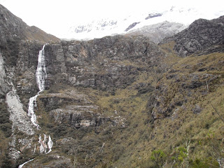 At this point in my story I would love to write what a wonderful experience I had hiking up to one of the most aesthetically beautiful places I have ever been, but it was horrific! Having not been properly acclimatized the altitude had finally hit me. We were at nearly 15,000 feet and climbing higher by the step. The trail began in a cow pasture with a slight incline. I couldn't do it. I would take a few steps and literally be gasping for breath. At first I tried to play it off. I was taking a lot of pictures and looking at the glaciers that were peering down upon us, but I had to show my weakness or there was no way in hell we were ever going to make it. Daniel handled the situation extremely well and was overly concerned with my condition. He tried his hardest to convince me to turn around, but I am as stubborn as an ox and simply would not hear it. I had been planning this hike for months and I had to see the lake. The sensation of not having enough oxygen in your lungs is nearly indescribable. First, it felt as if invisible hands were tightly bound around both of my lungs enabling the inhaling and exhaling process to occur. For awhile I thought I had a terrible stomach ache, but later realized that my lungs were actually aching. It was nothing like I had ever felt - lung cramp?! Seriously?! We would walk a few steps and I would have to stop and catch my breath, but then I would be fine. Stop and go, stop and go. This was our routine the entire way up. Waterfalls streamed carelessly down the slopes on either side of us. As we climbed even higher the air became thinner and thinner.