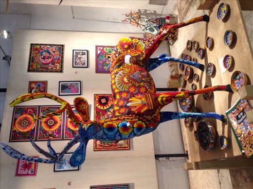 After an arvo nap we went to a really nice part of the city which had a beautiful church, boutique shops and nice restaurants. We chose a restaurant which you could eat on their rooftop and had a guy playing the guitar. The view was incredible with mountains surrounding all around and a great view of an impressive church (we went in here a couple of days later and the interior was incredible with the roof and walls detailed of religious figures and lined in gold). I ordered a margarita with mezcal (a traditional tequila, the taste is a lot smoker) and apparently a traditional Oaxacan dish which was cheese stuffed mushrooms, lightly crumbed and a bruschetta type dressing on top. It was delicious and Matt loved his too. A nice first dinner in Oaxaca we walked back along the streets to our hostel, stopping in a museum/shop/cafe to look at some amazing modern Mexican artwork inside. There were figurines painted in the colourful folk art and also ones that had thousands of tiny beads stuck to it to make the pattern. There was a huge deer (photo below, although you can't see the intricate details of the beads) which was a stand out. We played a game of pool back at the hostel before going to bed.